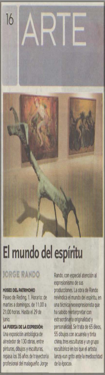 Una exposición antológica de alrededor de 130 obras, entre pinturas, dibujos y esculturas, repasa los 35 años de trayectoria profesional del malagueño Jorge Rando, con especial atención al expresionismo de sus producciones. La obra de Rando reivindica el mundo del espíritu, en una técnica neoexpresionista que ha sabido reinterpretar con extraordinaria originalidad y personalidad
