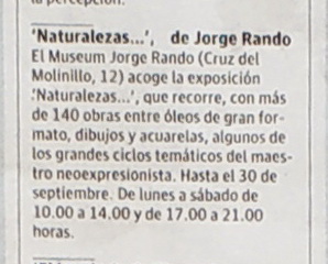 En cumplimiento con lo establecido en la Ley Orgánica 15/1999, de 13 de diciembre, de Protección de Datos de Carácter Personal, le comunicamos que los datos facilitados por usted pasarán a formar parte de una base de datos creada por la Fundación Jorge Rando con la finalidad exclusiva de poder dirigir a su atención envíos de información sobre las actividades organizadas por la Fundación. Usted tendrá derecho, en cualquier momento, de acceso, rectificación, cancelación u oposición respecto al tratamiento de sus datos. En ese caso, puede mandar una comunicación a info@museojorgerando.org o por correo postal adjuntando copia de identificación válida a: Fundación Jorge Rando, C/ Cruz del Molinillo, 12. Málaga, 29003. Legislación aplicable y jurisdicción competente Las presentes advertencias legales se rigen por la legislación española. Todos los conflictos que pudieran derivarse de su interpretación, aplicación y cumplimiento, se someterán a los Juzgados y Tribunales de Madrid (España), renunciando expresamente las partes a cualquier otro fuero que pudiera corresponderles.
