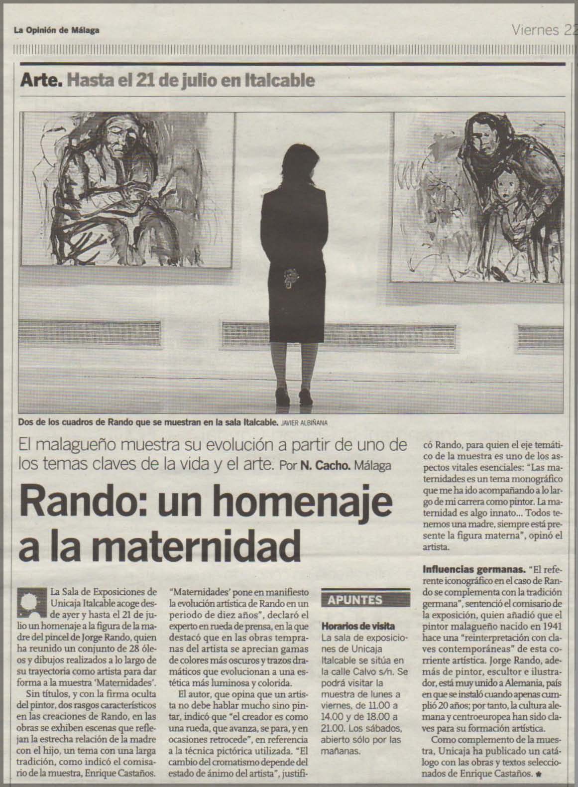La Sala de Exposiciones de Unicaja Italcable acoje desde ayer y hasta el 21 de julio un homenaje a la figura de la madre del pincel de Jorge Rando, quien ha reunido un conjunto de 28 óleos y dibujos realizados a lo largo de su trayectoria como artista para dar forma a la muestra "Maternidades".