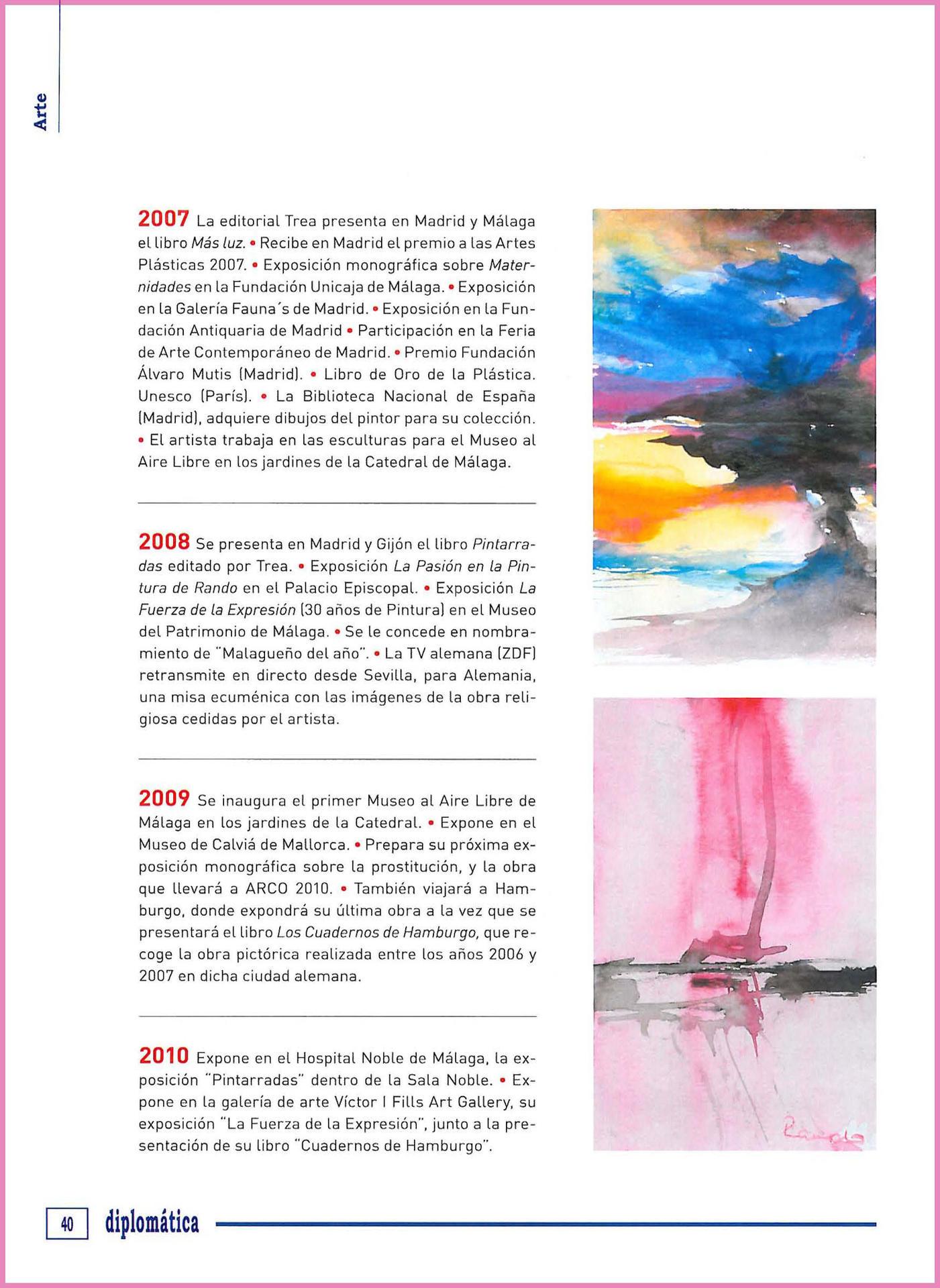 2007- La editorial Trea presenta en Madrid y Málaga el libro Más Luz -Recibe en Madrid el premio a las artes plásticas 2007-. Exposición monográfica sobre Maternidades en la Fundación Unicaja de Málaga.