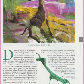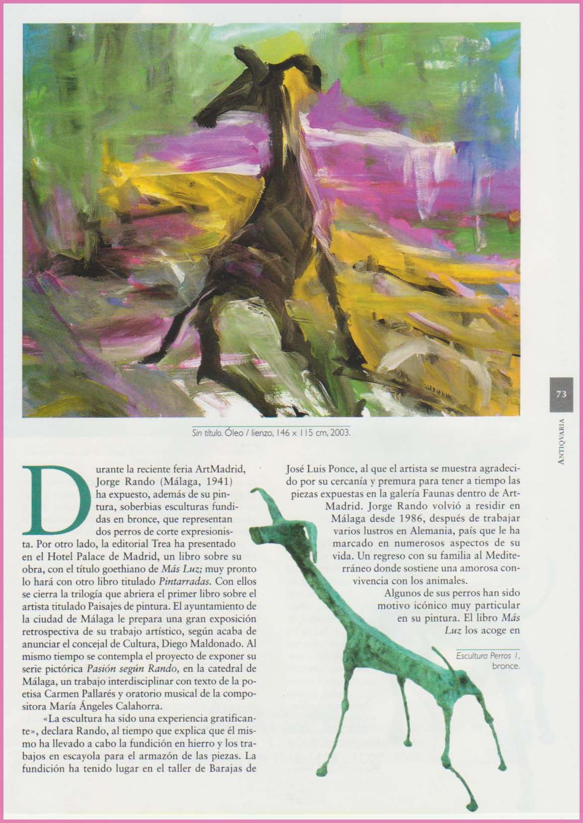 Durante la reciente feria ArtMadrid, Jorge Rando (Málaga, 1941) ha expuesto, además de su pintura, soberbias esculturas fundidas en bronce, que representan dos perros de corte expresionista. Por otro lado, la editorial Trea ha presentado en el Hotel Palace de Madrid, un libro sobre su obra, con el título goethiano de Más Luz; muy pronto lo hará con otro libro titulado Pintarradas.