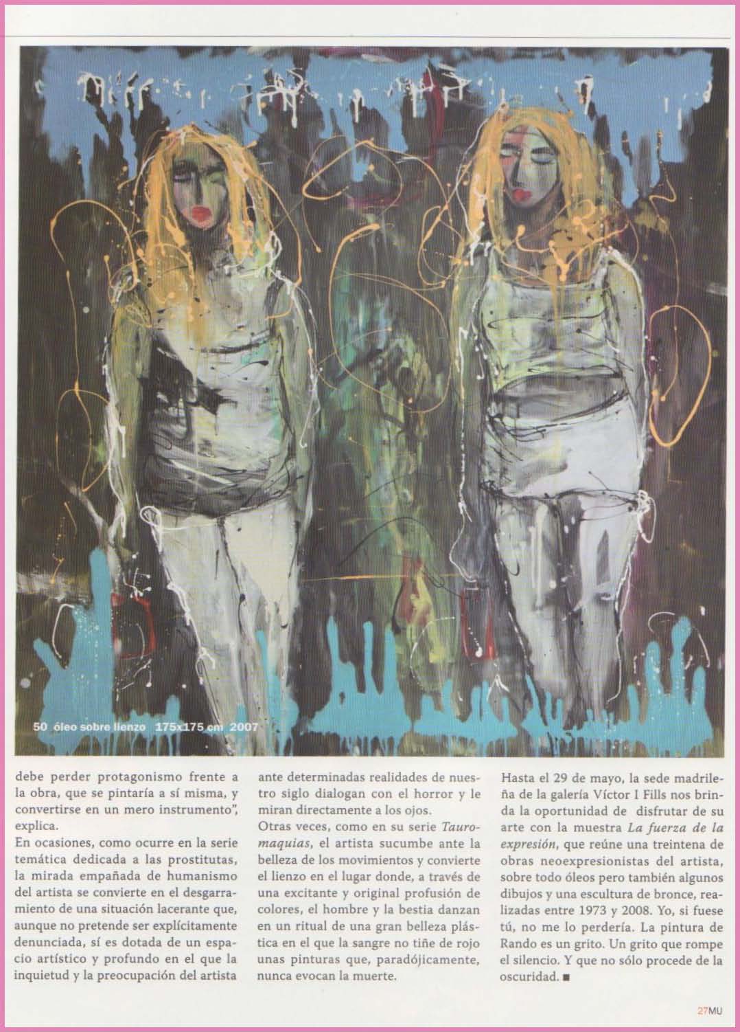 En ocasiones, como ocurre en la serie temática dedicada a las prostitutas, la mirada empañada de humanismo del artista se convierte en el desgarramiento de una situación lacerante que, aunque no pretende ser explícitamente denunciada, sí es dotada de un espacio artístico y profundo en el que la inquietud y la preocupación del artista ante determinadas realidades de nues¬tro siglo dialogan con el horror y le miran directamente a los ojos.