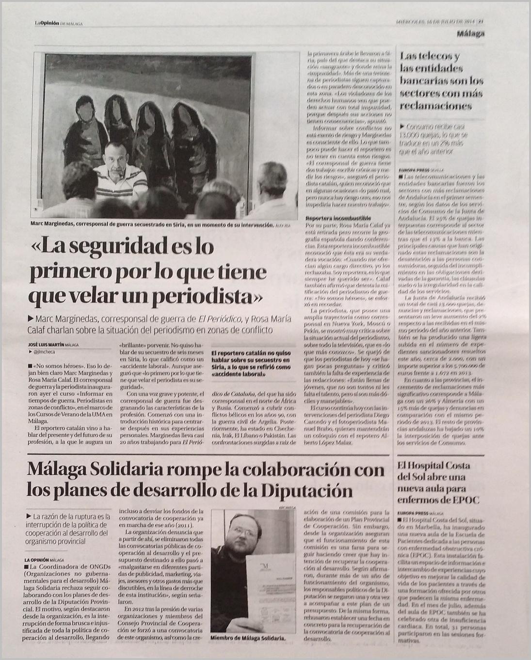 "No somos héroes". Eso lo dejan bien claro Marc Marginedas y Rosa María Calaf. El corresponsal de guerra y la periodista inauguraron ayer el curso "Informar en tiempos de guerra". Periodistas en zona de conflicto", en el marco de los Cursos de Verano de la UMA en Málaga.