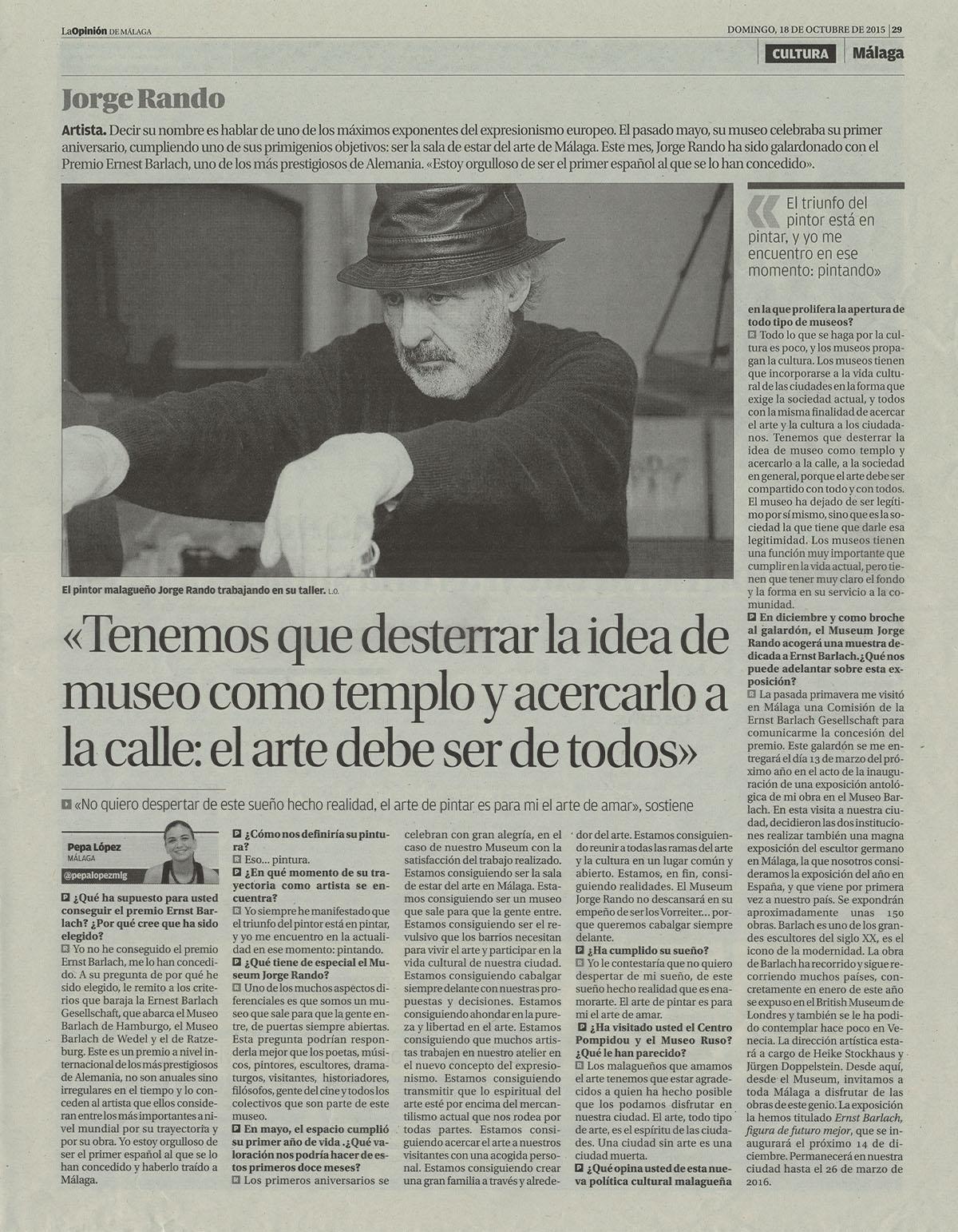 Decir su nombre es hablar de uno de los máximos exponentes del expresionismo europeo - El pasado mayo el Museo Jorge Rando celebraba su primer aniversario, cumpliendo uno de sus primigenios objetivos: ser la sala de estar del arte de Málaga
