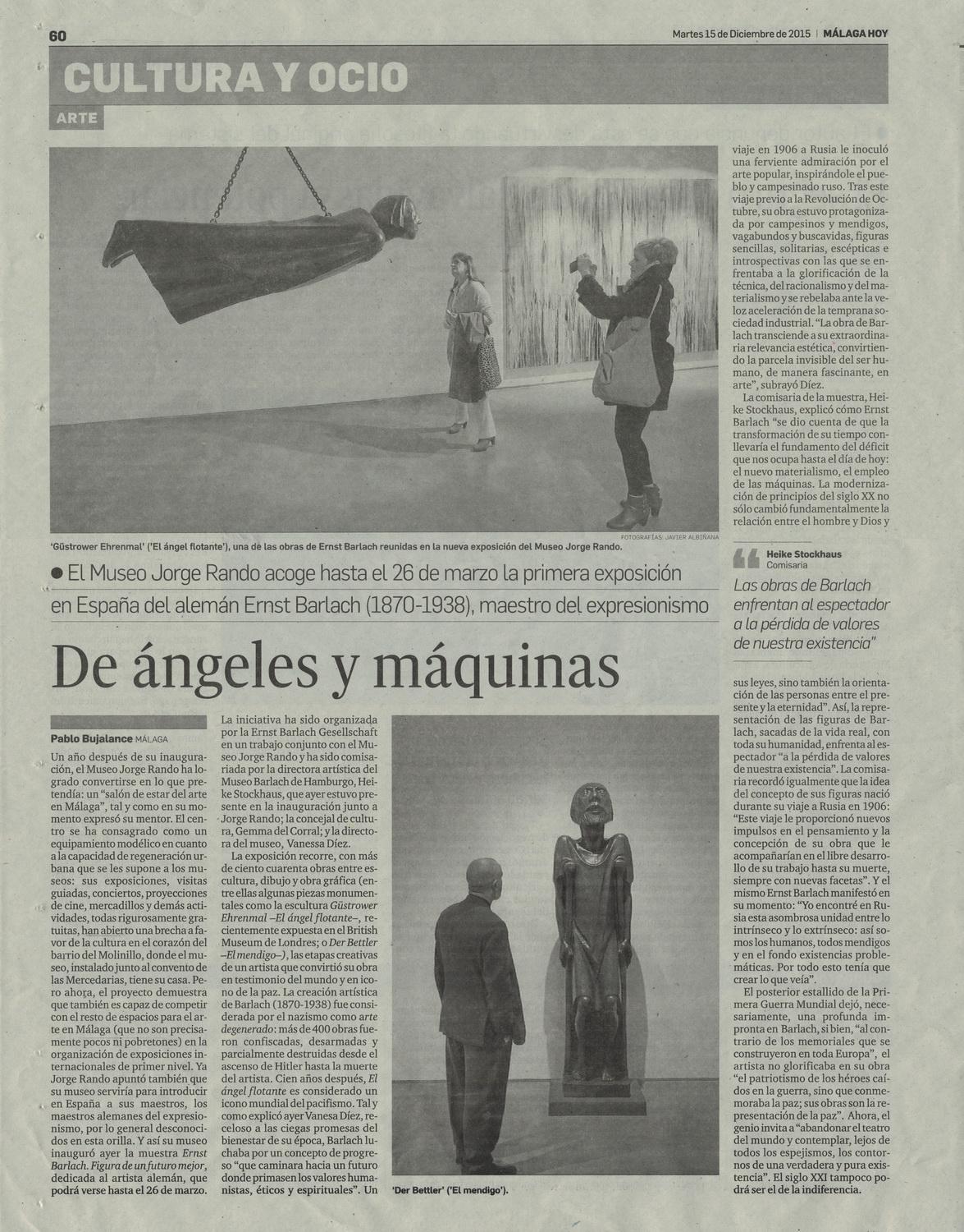 Un año después de su inauguración, el Museo Jorge Rando ha logrado convertirse en lo que pretendía: un "salón de estar del arte en Málaga", tal y como en su momento expresó su mentor. El centro se ha consagrado como un equipamiento modélico en cuanto a la capacidad de regeneración urbana que se les supone a los museos: sus exposiciones, visitas guiadas, conciertos, proyecciones de cine, mercadillos y demás actividades, todas rigurosamente gratuitas, han abierto una brecha a favor de la cultura en el corazón del barrio del Molinillo, donde el museo, instalado junto al convento de las Mercedarias, tiene su casa. Pero ahora, el proyecto demuestra que también es capaz de competir con el resto de espacios para el arte en Málaga (que no son precisamente pocos ni pobretones) en la organización de exposiciones internacionales de primer nivel. Ya Jorge Rando apuntó también que su museo serviría para introducir en España a sus maestros, los maestros alemanes del expresionismo, por lo general desconocidos en esta orilla. Y así su museo inauguró ayer la muestra Ernst Barlach. Figura de un futuro mejor, dedicada al artista alemán, que podrá verse hasta el 26 de marzo. La iniciativa ha sido organizada por la Ernst Barlach Gesellschaft en un trabajo conjunto con el Museo Jorge Rando y ha sido comisariada por la directora artística del Museo Barlach de Hamburgo, Heike Stockhaus, que ayer estuvo presente en la inauguración junto a Jorge Rando; la concejal de cultura, Gemma del Corral; y la directora del museo, Vanessa Díez.