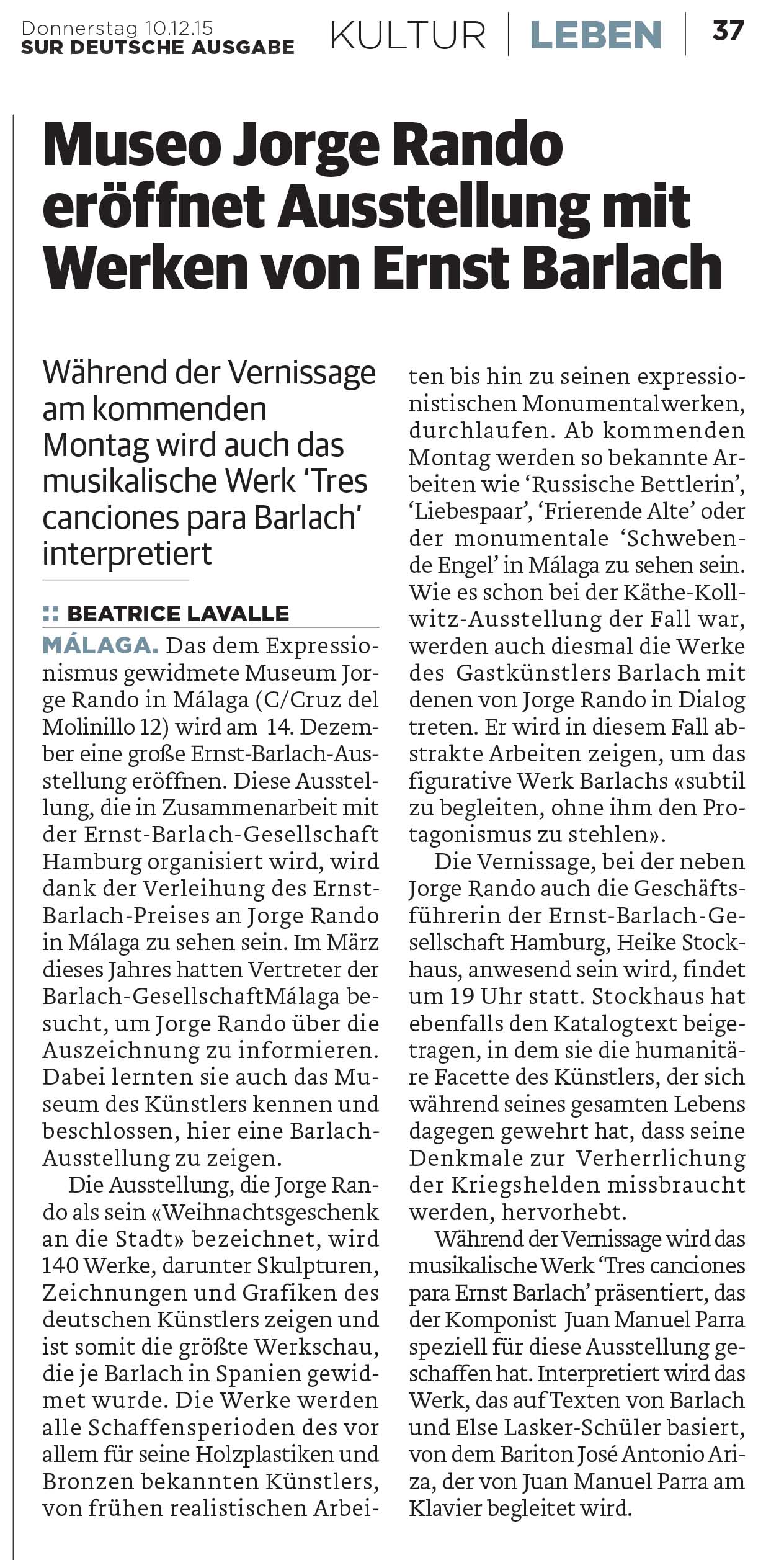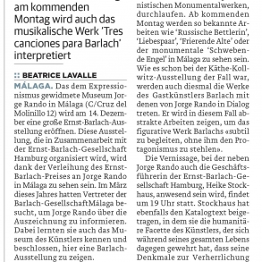 Das dem Expressionismus gewidmete Museum Jorge Rando in Málaga (C/Cruz del Molinillo 12) wird am 14. Dezember eine große Ernst-Barlach-Ausstellung eröffnen. Diese Ausstellung, die in Zusammenarbeit mit der Ernst-Barlach-Gesellschaft Hamburg organisiert wird, wird dank der Verleihung des ErnstBarlach-Preises an Jorge Rando in Málaga zu sehen sein. Im März dieses Jahres hatten Vertreter der Barlach-GesellschaftMálaga besucht, um Jorge Rando über die Auszeichnung zu informieren. Dabei lernten sie auch das Museum des Künstlers kennen und beschlossen, hier eine BarlachAusstellung zu zeigen. Die Ausstellung, die Jorge Rando als sein «Weihnachtsgeschenk an die Stadt» bezeichnet, wird 140 Werke, darunter Skulpturen, Zeichnungen und Grafiken des deutschen Künstlers zeigen und ist somit die größte Werkschau, die je Barlach in Spanien gewidmet wurde. Die Werke werde  alle Schaffensperioden des vor allem für seine Holzplastiken und Bronzen bekannten Künstlers, von frühen realistischen Arbeitennbis hin zu seinen expressionistischen Monumentalwerken, durchlaufen. Ab kommenden Montag werden so bekannte Arbeiten wie ‘Russische Bettlerin’, ‘Liebespaar’, ‘Frierende Alte’ oder der monumentale ‘Schwebende Engel’ in Málaga zu sehen sein. Wie es schon bei der Käthe-Kollwitz-Ausstellungn der Fall war, werden auch diesmal die Werke des Gastkünstlers Barlach mit denen von Jorge Rando in Dialog treten. Er wird in diesem Fall ab - strakte Arbeiten zeigen, um das figurative Werk Barlachs «subtil zu begleiten, ohne ihm den Protagonismus zu stehlen».